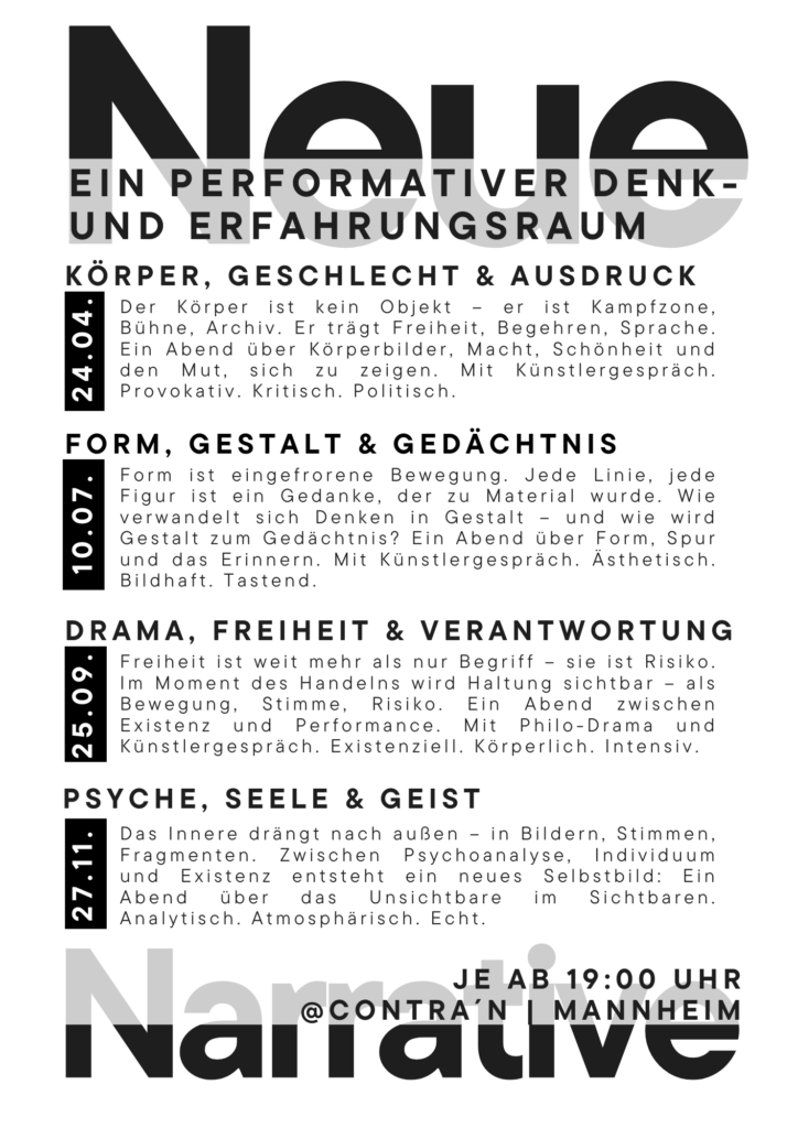 Neue Narrative entstehen dort, wo die Welt nicht erklärt, sondern hinterfragt wird. Gemeinsam öffnen wir einen experimentellen Raum zwischen Philosophie, Kunst und Erfahrung.